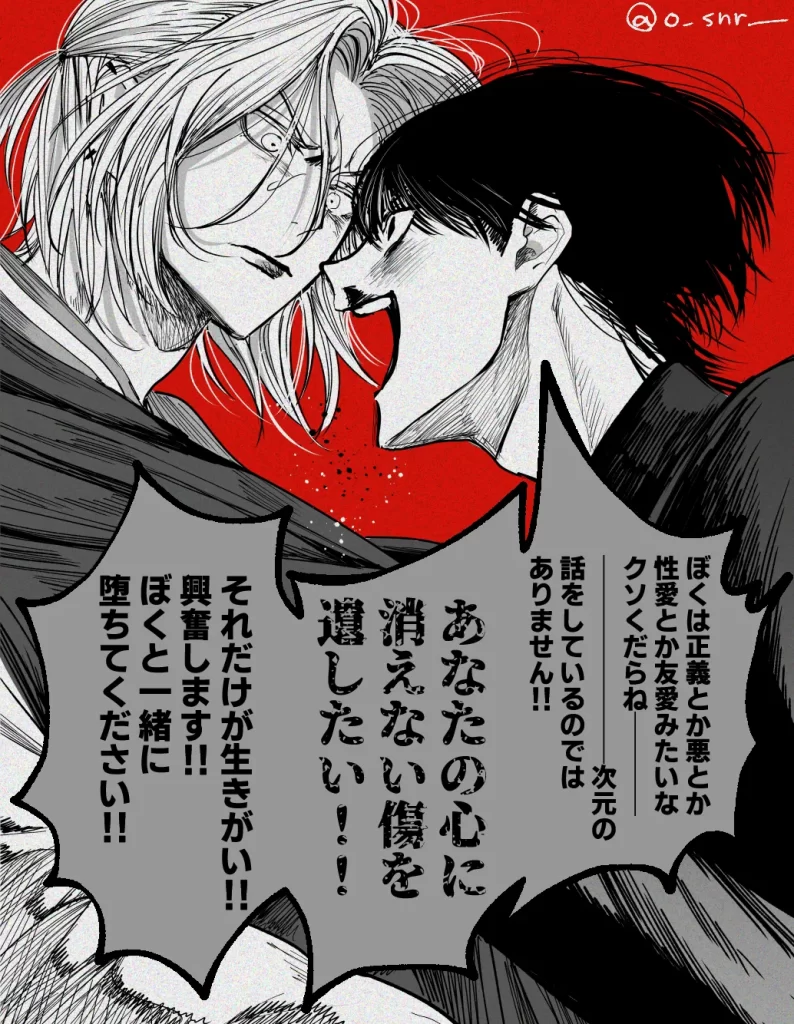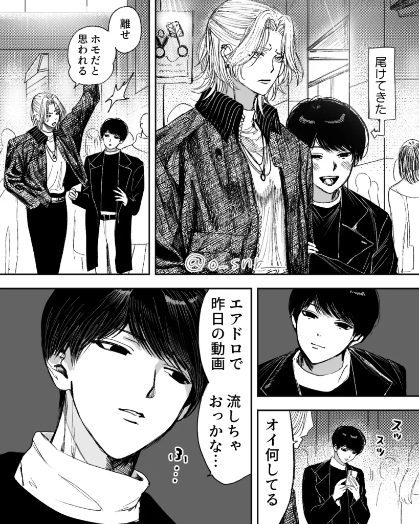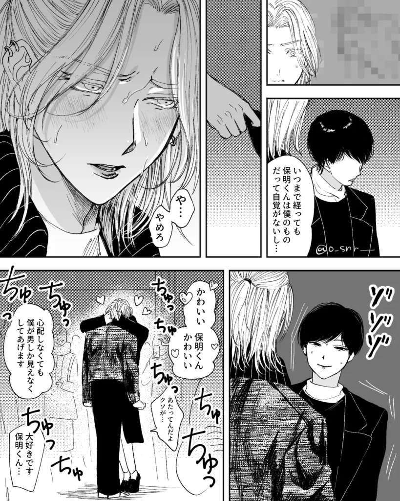 創作BLです。モブ顔が野島圭(のじまけい)、金髪が馬場保明(ばばやすあき)くんです。 2024年12月にXに投稿したところ、反応があったので続きを描くことにしました。 商業連載になる予定です。ありがとうございます。エスカレートする圭の執着と、転がり落ちる中での保明くんの失われない気高さを描けたらと思います。